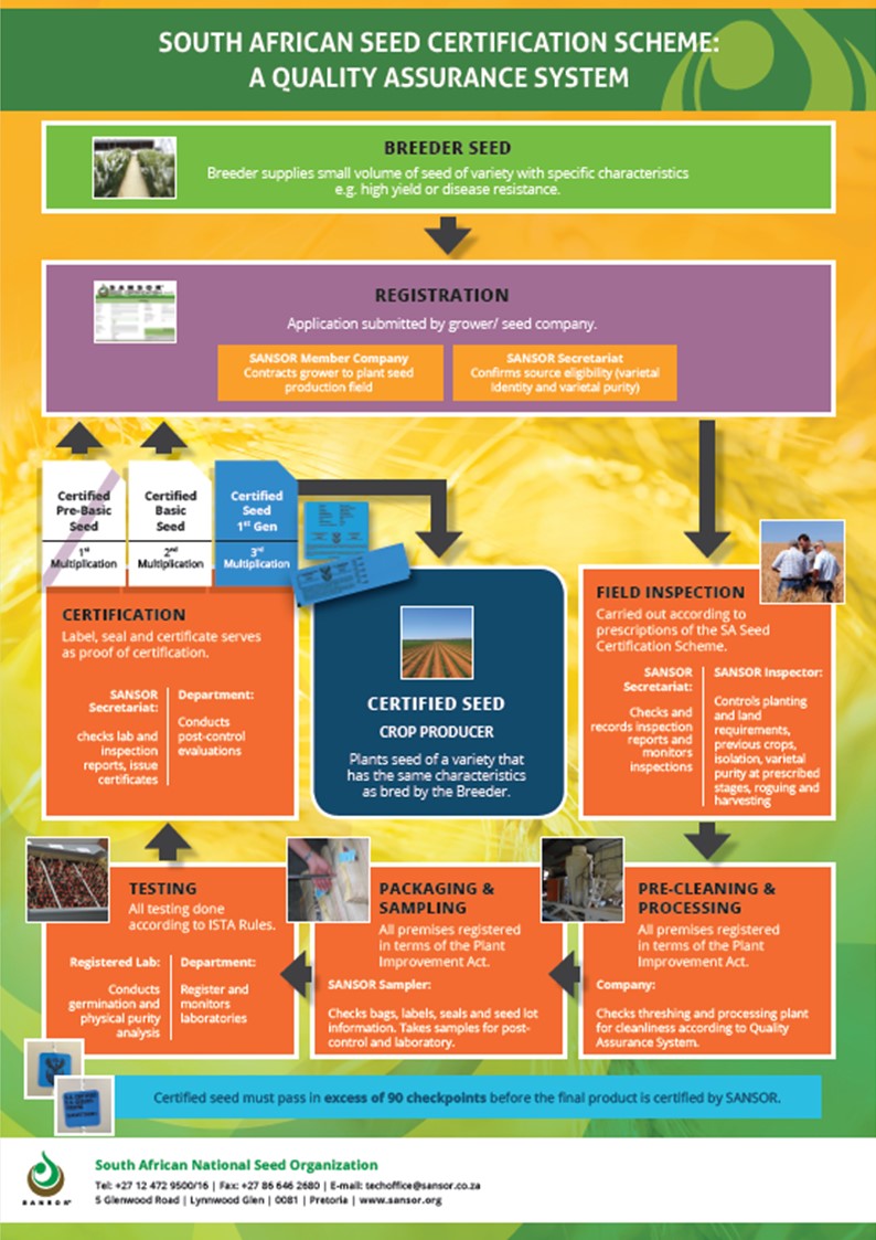 During each of the various multiplication processes, complete control is performed, whereby each seed production unit is registered with SANSOR. SANSOR first checks the origin and certifiability of the parent seed of the variety concerned before the unit is accepted for seed production for certification. Plants are inspected by SANSOR trained and authorized inspectors at specific growth stages to determine, among other things, that the plants comply with the prescribed minimum requirements for varietal purity and identity. This includes aspects such as controlling isolation distances, previous cropping, volunteer plants, off-types, etc. which may compromise the varietal purity of the seed. For each inspection performed, a report is submitted to SANSOR which then records the finding. The inspection process is continuously monitored by SANSOR, as well as by officials of the Department of Agriculture, Land Reform and Rural Development (DALRRD).